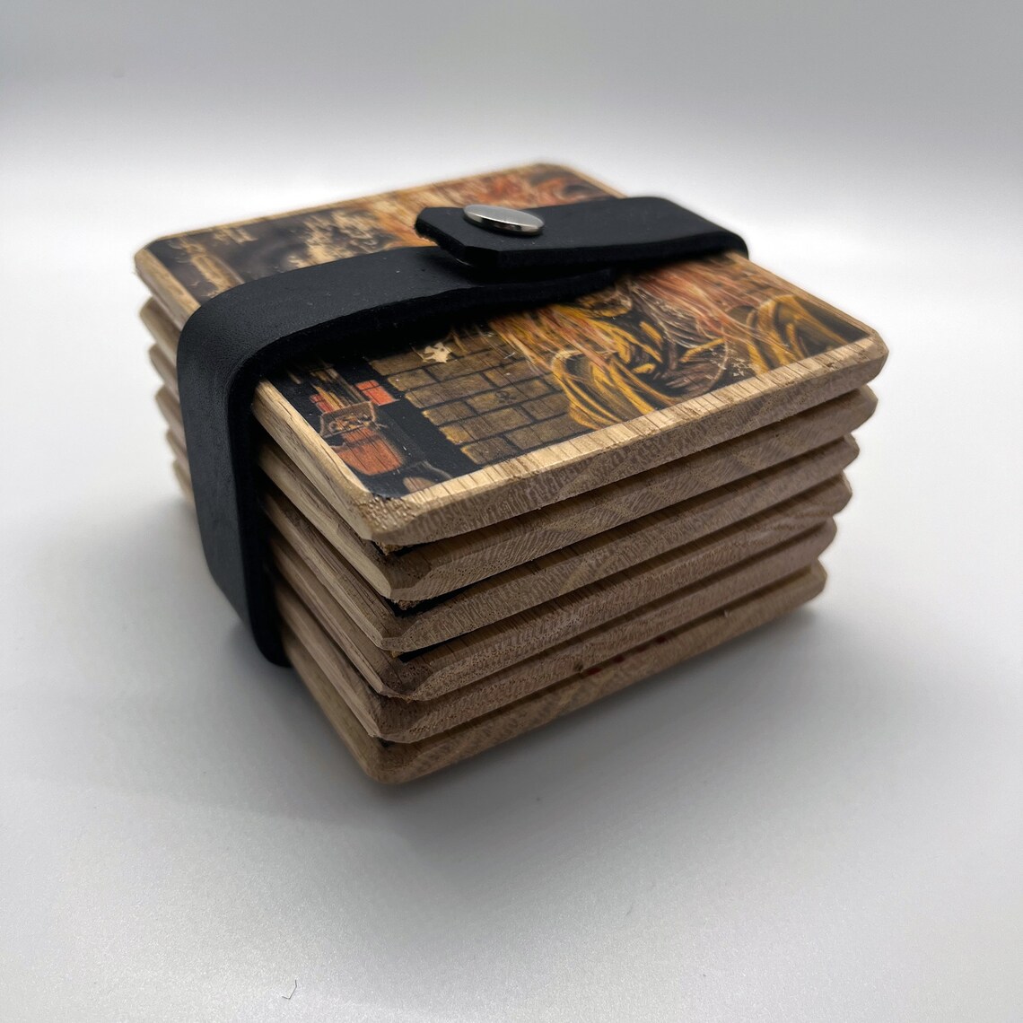Ink transfer to 3.5″ x 3.5” red oak. Finished in polycrylic and a 2mm Cork mat. Available handmade leather strap color (red, pure black, bourbon brown, rust red or suede apricot) & snaps (bronze, sliver, gold or gun metal) depend on stock. Leave a note with your preference and we will do our best to accommodate.Item is handmade to order.