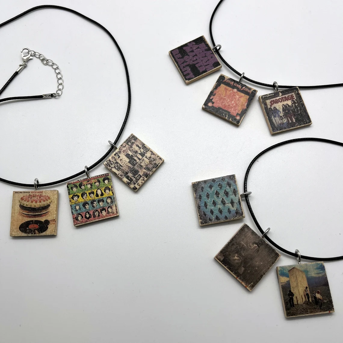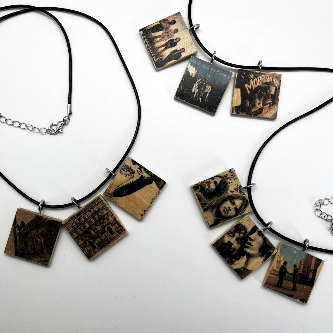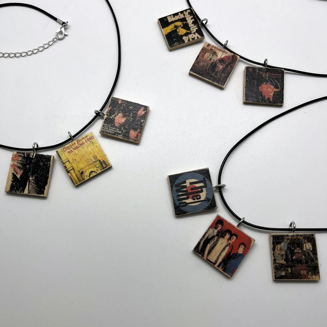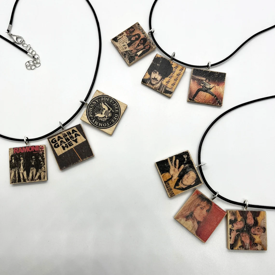 Each necklace includes 3 (1” x 1/8”) birch wood tiles, double sided with ink transfers of iconic album covers and artist pics. Choose from a growing number of our rock legend sets.