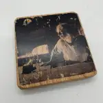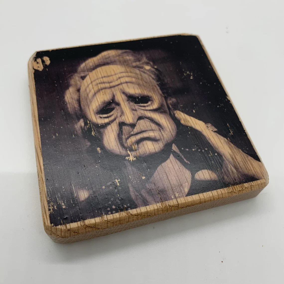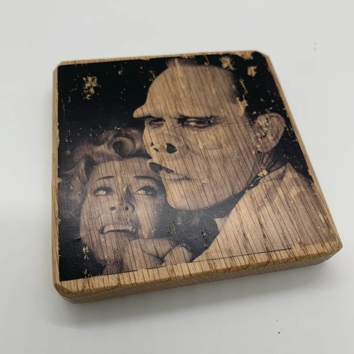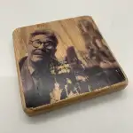 Ink transfer to 3.5″ x 3.5” red oak. Finished in polycrylic and a 2mm Cork mat. Available handmade leather strap color (pure black, bourbon brown, rust red or suede apricot) & snaps (bronze, sliver, gold or gun metal) depend on stock. Leave a note with your preference and we will do our best to accommodate.Item is handmade to order.